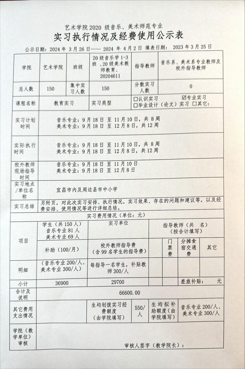 艺术学院2020级音乐、美术师范专业实践经费公示