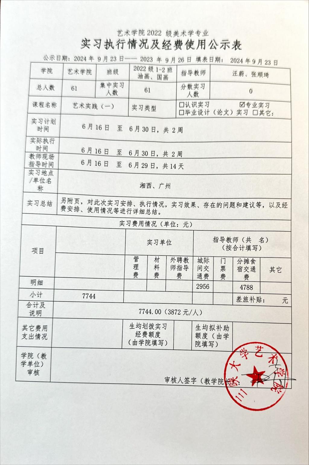 艺术学院2022级美术学专业实践经费公示